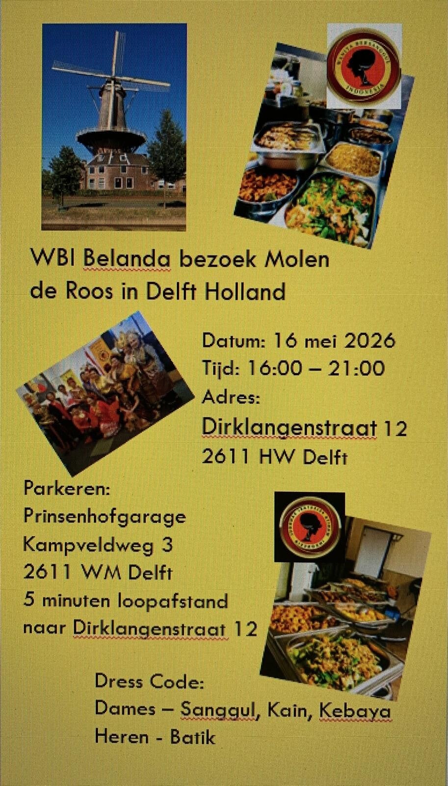 | 16-05-2026 | Uitstapje naar Delft (eten) en molen bezoek | €22,50 | Delft bij Yani in proces | Coming |