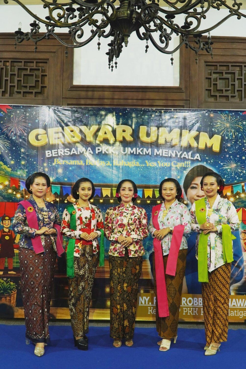 Vertegenwoordigers van WANITA PELESTARI SANGGUL INDONESIA (WANITA BERSANGGUL INDONESIA) Salatiga bij het bijwonen van de Wungon Leather Puppet Show in Pendopo Bung Karno Salatiga met Mr. Dance Ishak Palit, MSi. (hoofd van Salatiga DPRD)